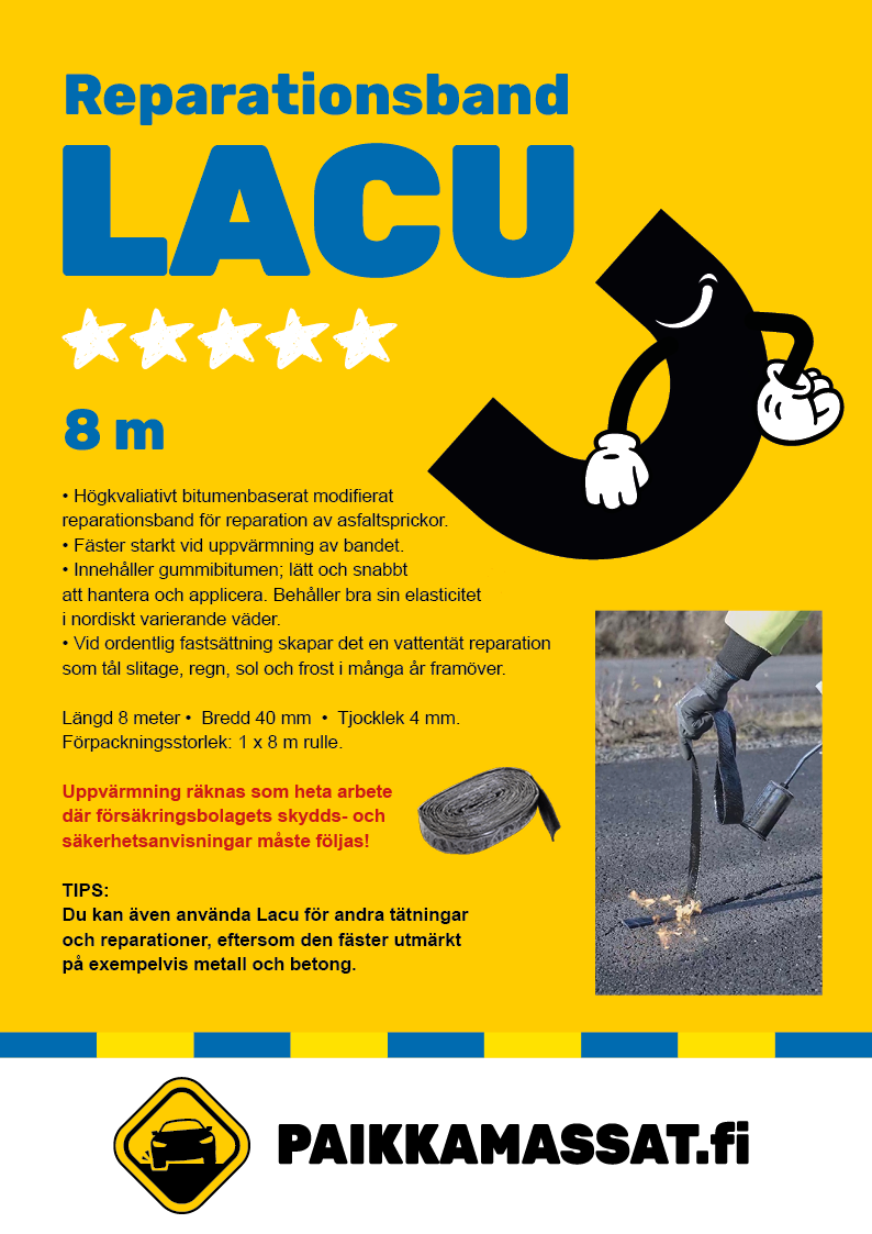 Vinkki! Voit käyttää Lacu nauhaa myös muihin tiivistys- ja korjauskohteisiin, sillä se tarttuu erinomaisesti kiinni esimerkiksi metalliin ja betoniin.